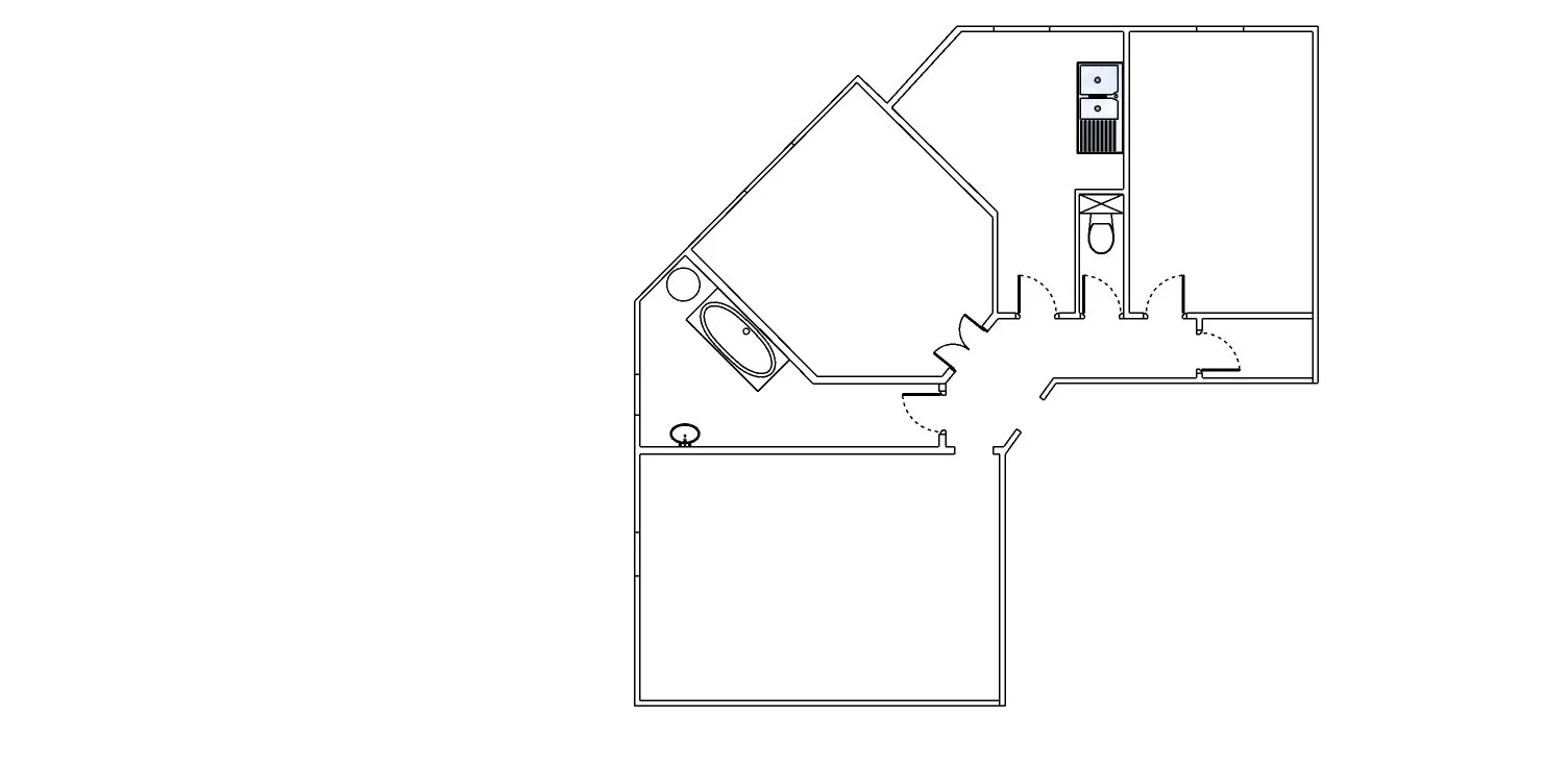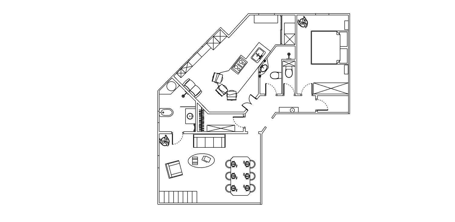 L’appartement fait un angle et a donc la forme “en éventail” avec une cuisine et une salle de bain pas du tout fonctionnelles ni pratiques à cause d’un couloir pour y accéder. Mes clients souhaitent une deuxième salle de bain et un deuxième toilette. Ils aiment recevoir et souhaite une grande cuisine avec beaucoup de rangements, ouverte avec un îlot.